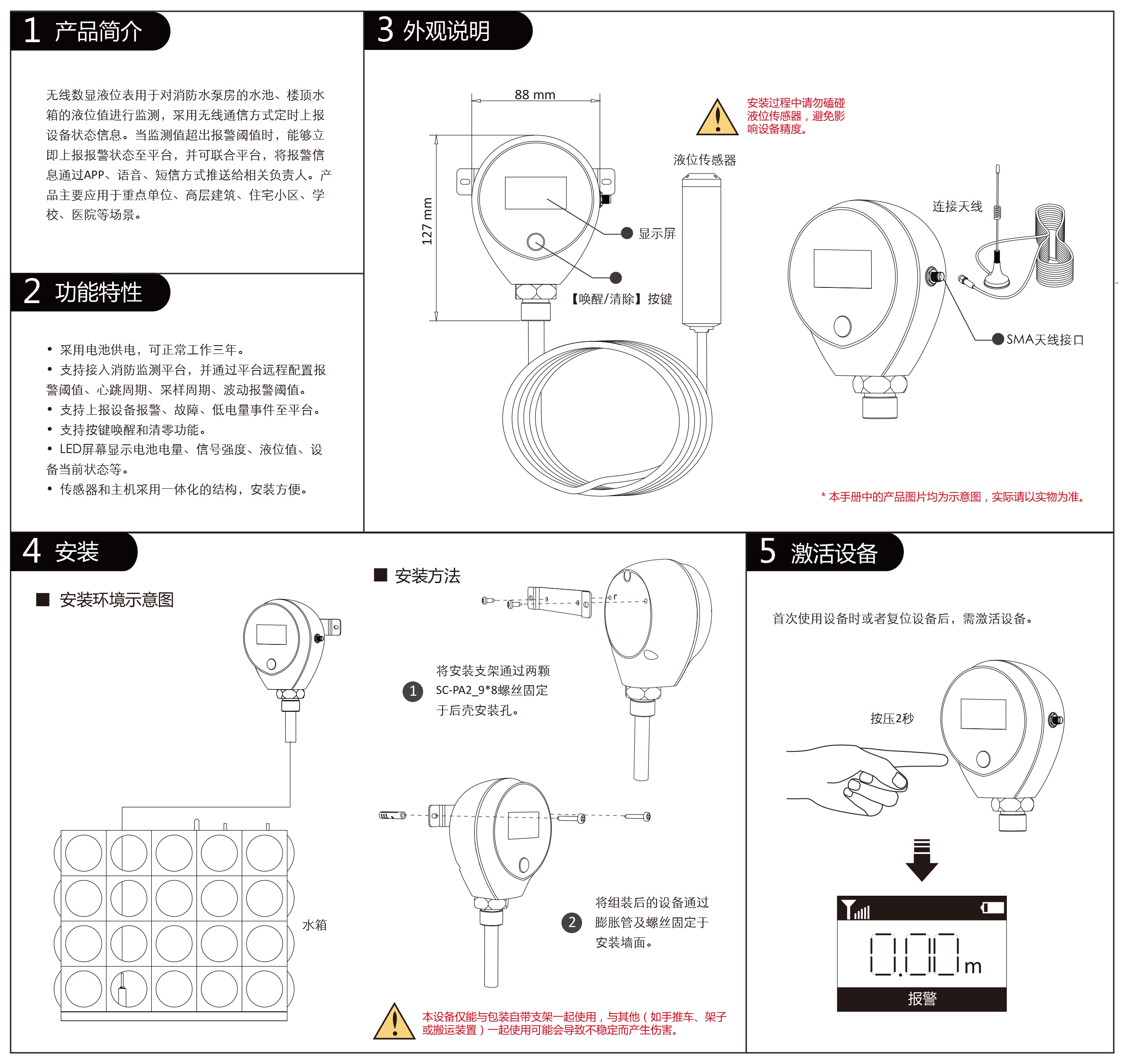 無線數顯液位表用于對消防水泵房的水池、樓頂水 箱的液位值進行監測,采用無線通信方式定時上報 設備狀態信息。