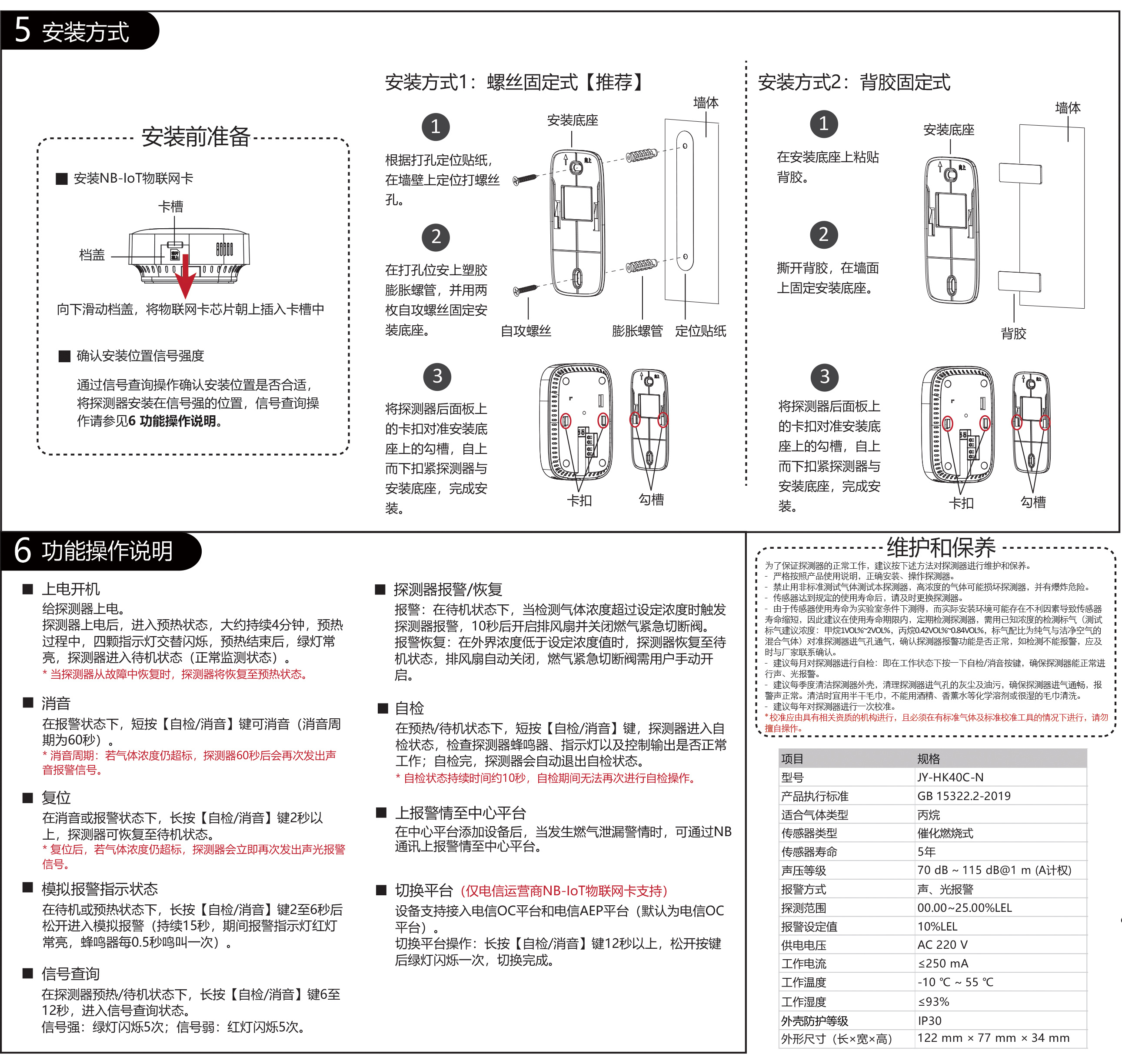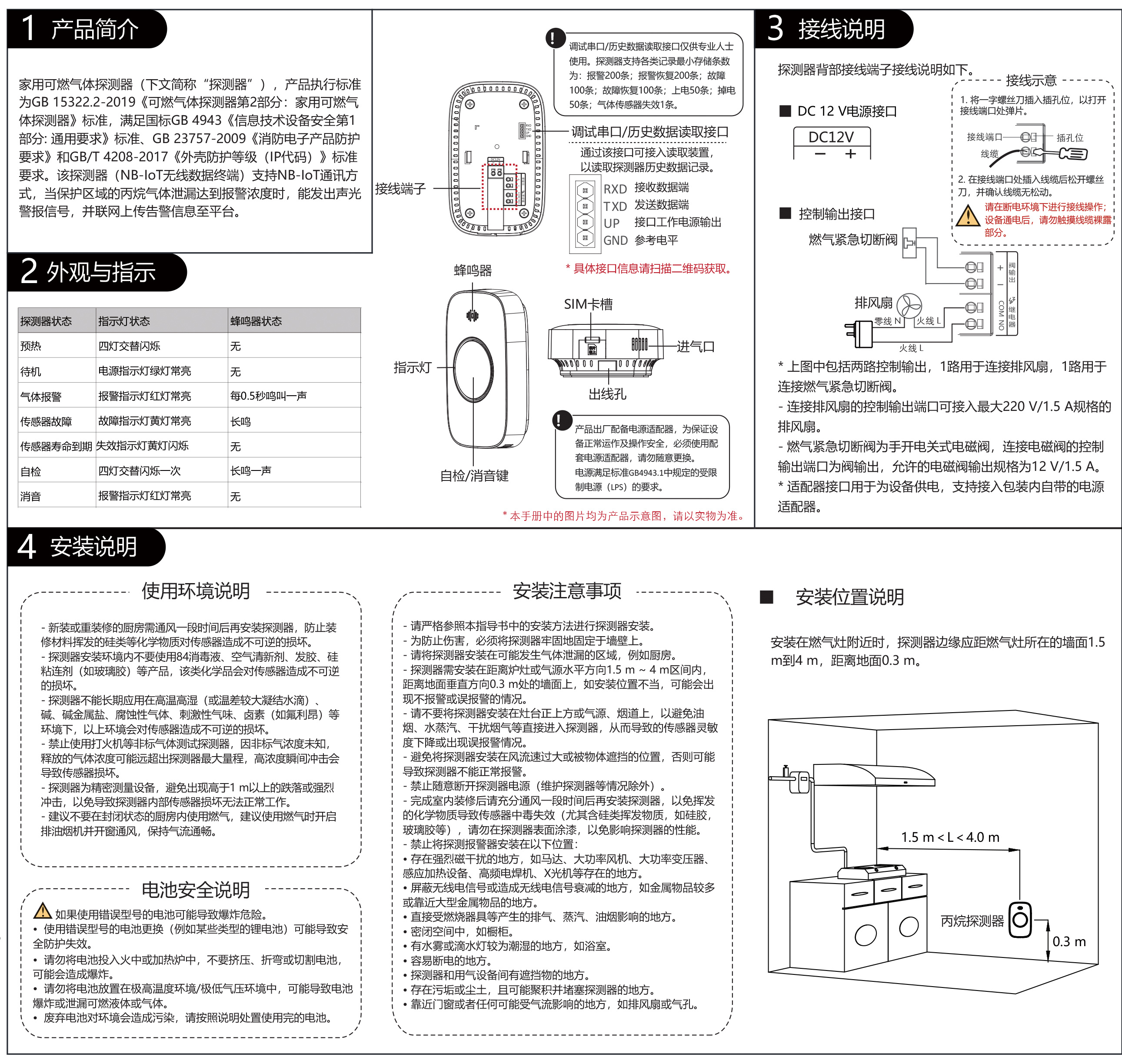 家用可燃氣體探測器(下文簡稱“探測器”),產品執行標準 為GB 15322.2-2019《可燃氣體探測器第2部分:家用可燃氣 體探測器》標準,滿足國標GB 4943《信息技術設備安全第1 部分: 通用要求》標準、GB 23757-2009《消防電子產品防護 要求》和GB/T 4208-2017《外殼防護等級(IP代碼)》標準 要求。該探測器(NB-IoT無線數據終端)支持NB-IoT通訊方 式,當保護區域的丙烷氣體泄漏達到報警濃度時,能發出聲光 警報信號,并聯網上傳告警信息至平臺。